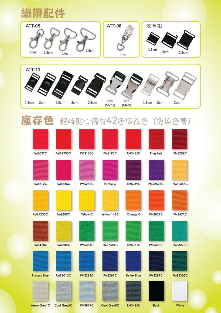 織帶類:水鑽織帶、識別證帶、識別帶、登山勾織帶、圓繩緹花帶、寵物帶、狗繩、雙層織帶、鬆緊帶、日記帶、環保織帶、熱轉印織帶、行李帶、箱包帶、尼龍織帶、特多龍織帶、反光織帶、易拉扣、易拉得、鞋帶、中空帶、相機背帶、證件帶、掛帶、吊繩、水壺帶、伸縮拉環、悠遊卡套、公車卡套、軟膠證件套。